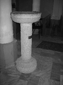 A destra di chi entra la pila in pietra dell’acqua santa del 1583 e recentemente ripristinata; fu posta la prima volta dal parroco Pietro Fusca, che resse la cura dal 1565 al 1594, nel suo 18° anno di ministero parrocchiale. Attorno si legge: “Die XVIII Luglio I. S. (ipse scripsit) 18 Petrus Fusca rector”.